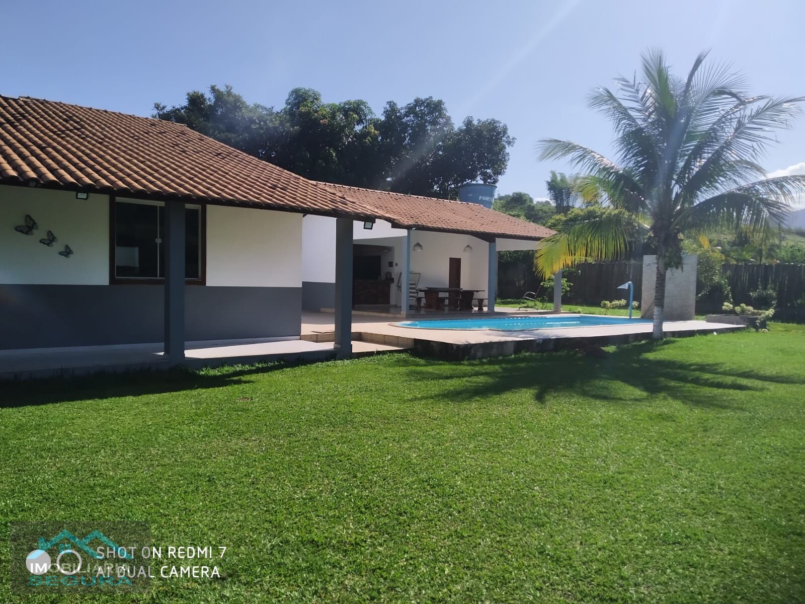 Área externa com Espaço Gourmet, churrasqueira, piscina, campo e pomar.